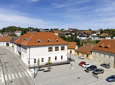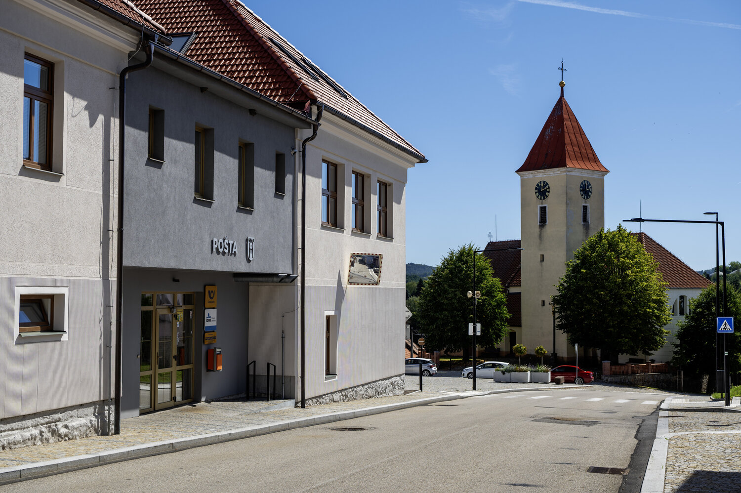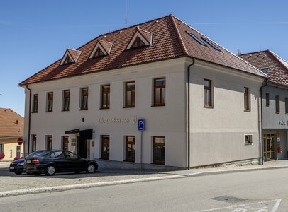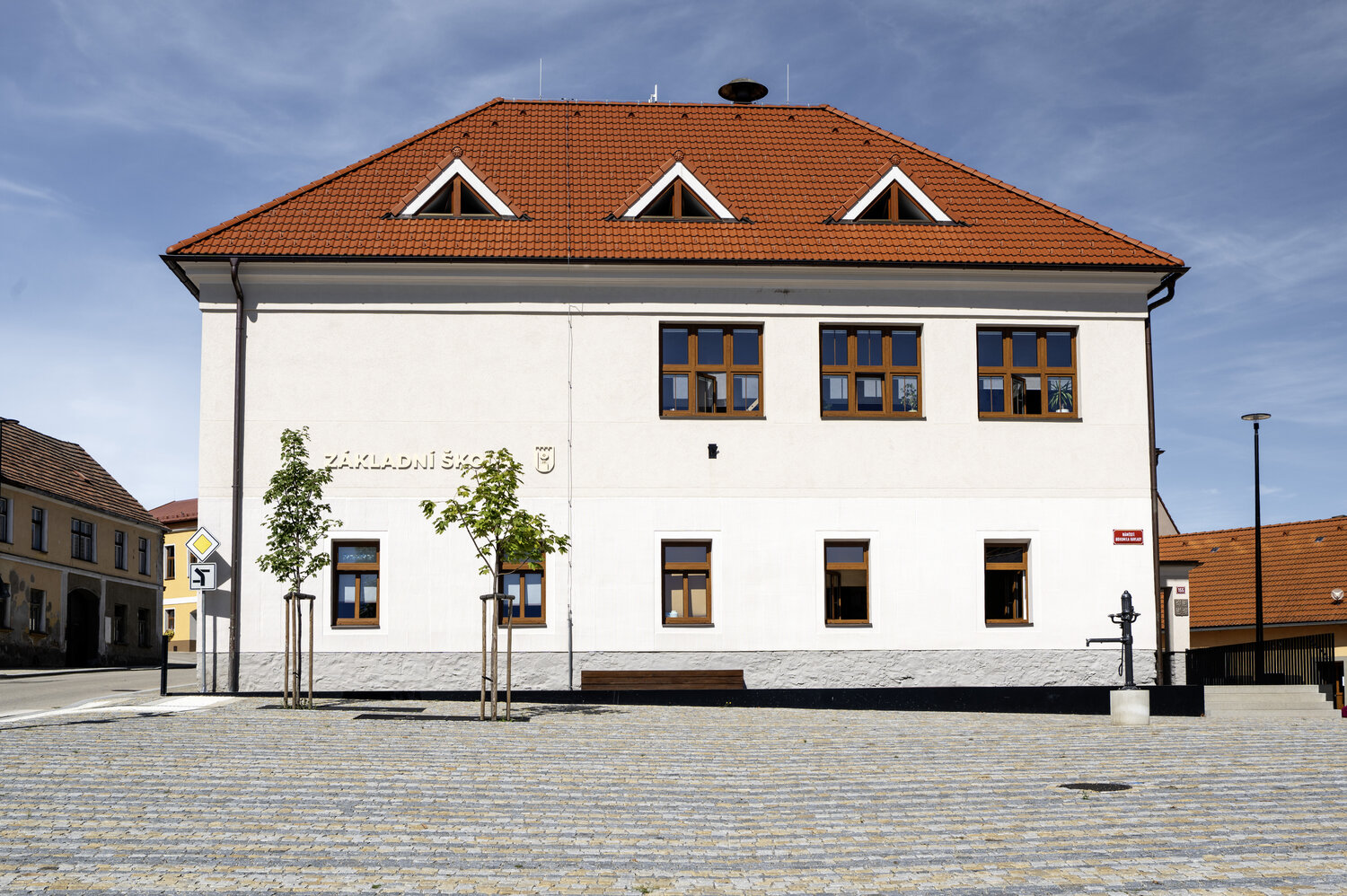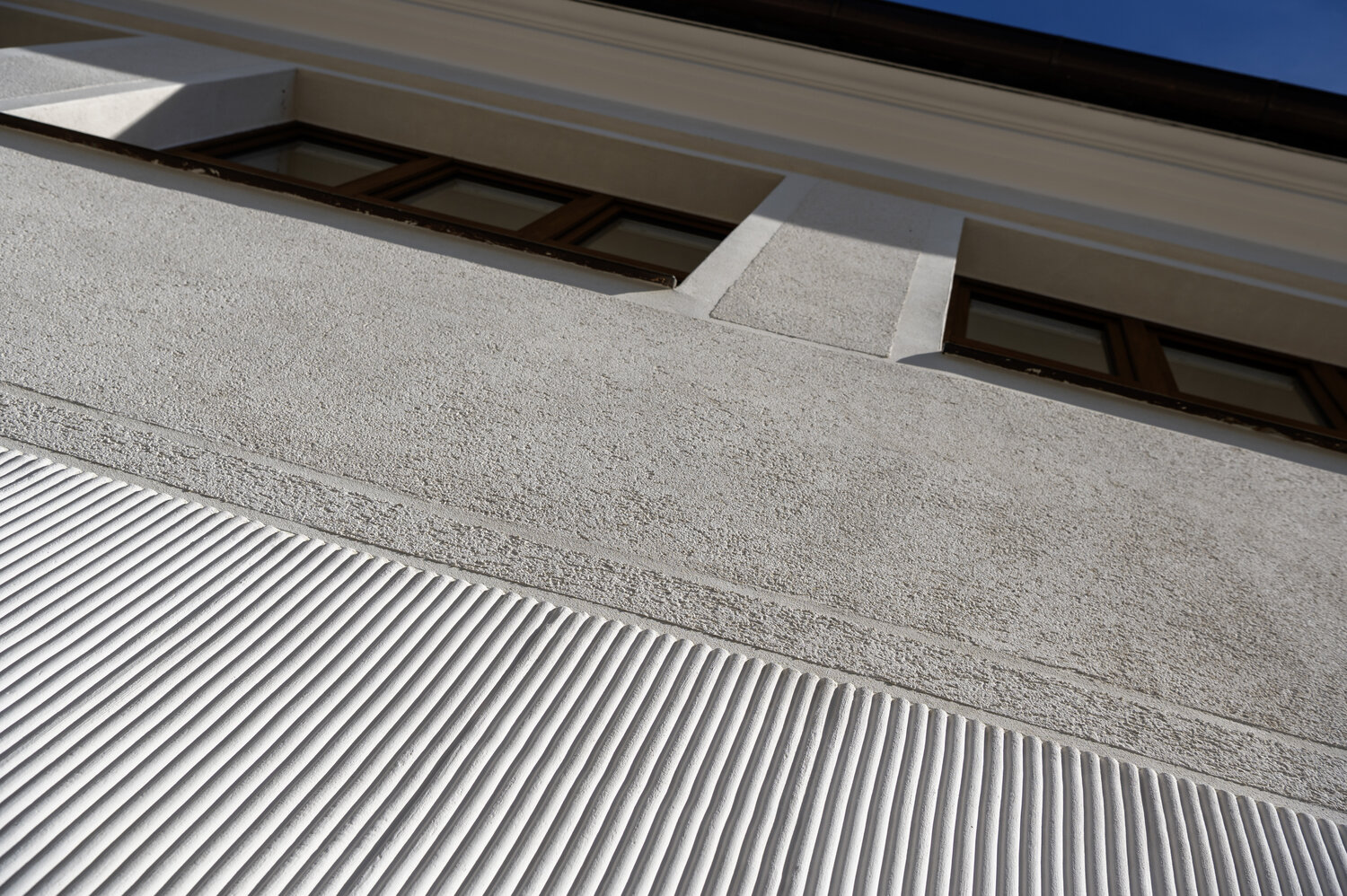 V ďalšom kroku bol nanesený produkt 2610 PENETRÁCIA PREFARBENÁ, aby bolo možné aplikovať fasádnu omietku 2727 ACTIVCEM. Ide o vysoko odolnú fasádnu omietku vystuženú vláknami, ktoré zabezpečujú vynikajúcu mechanickú odolnosť. Zároveň je táto omietka odolná voči znečisteniu, a preto je vhodná aj do oblastí so zvýšenou premávkou, čo je aj prípad tejto lokality – verejného námestia. Omietkar (Sid. pt spol. s r. o. – Prachatice) použil tri veľkosti zŕn. Vďaka tejto nuancii vznikli na povrchu fasády 3D reliéfy a okenné rámy.