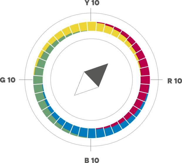 Každá štvrtina obsahuje 10 farevbných tónov, ktoré na seba plynulo naväzujú.