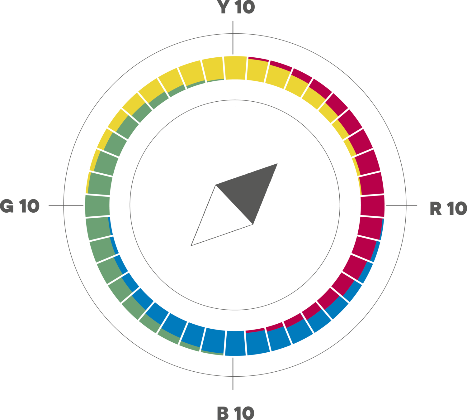 Vo vzorkovníku Cemix Color Compass sú 4 základné farebné smery – žltá (Y), červená (R), modrá (B) a zelená (G) – usporiadané do kruhu.